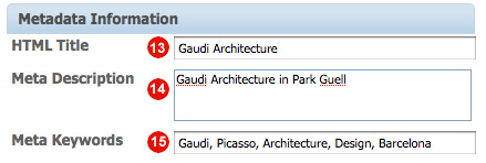 13. HTML Title: This is what you want displayed on the browser title.